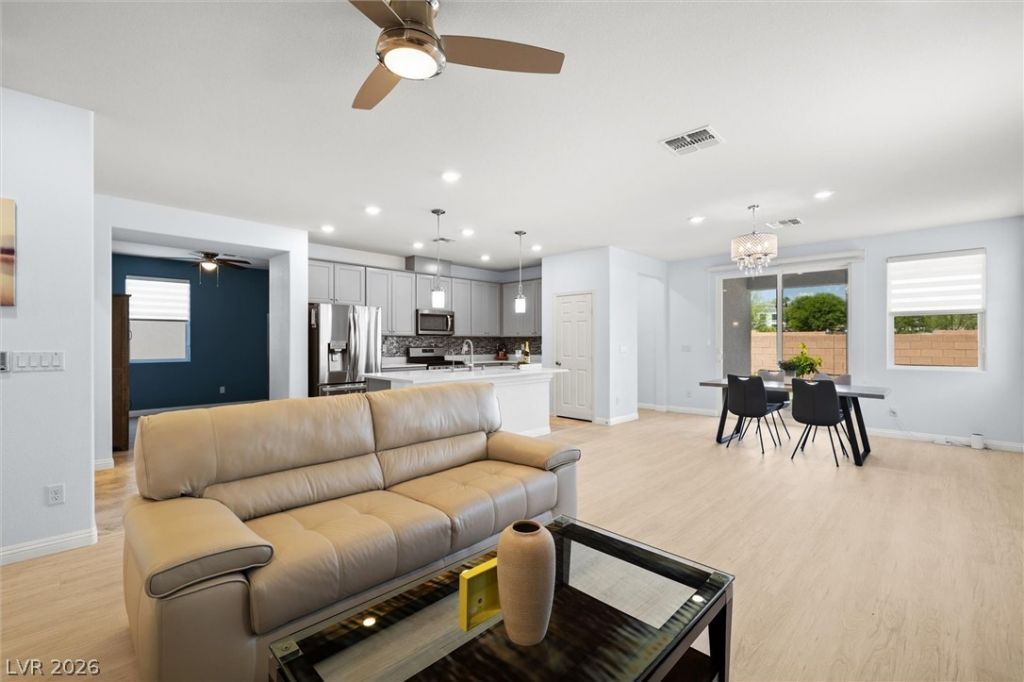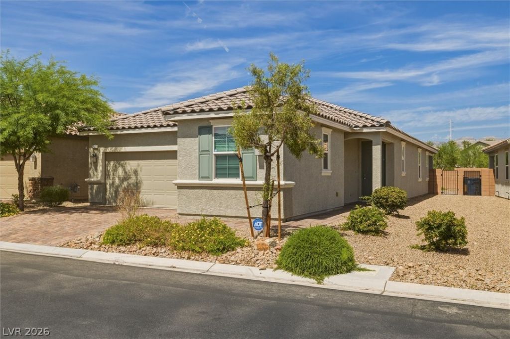 **SOLAR PAYOFF**This 2019 single-story home in a gated Southwest community offers 3 bedrooms, 2 bathrooms, and a versatile den that was a structural builder upgrade?ideal as an office, gym, or additional living area. The open floor plan highlights a kitchen with custom cabinetry, stainless steel appliances, a pull-out drawer system, and an RO drinking water system. The primary suite includes a walk-in closet, a shower-tub combo, and a bidet-equipped toilet, while the second bedroom also features a walk-in closet. Fully paid-off solar panels provide substantial energy savings. The garage is equipped with storage cabinets and overhead racks. The backyard features low-maintenance artificial turf, a covered patio, a paver-lined garden retreat, and a water softener. Easy to access 215 freeway, restaurants, shopping, Costco, the airport, and the Strip, this home is located in one of the heart of Southwest in Las Vegas. Move-in ready! it's a perfect blend of comfort and convenience.